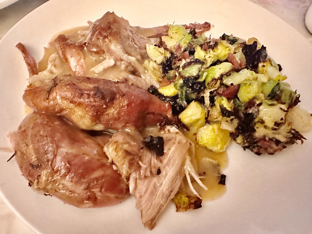 Carl's pork shoulder with pan sauce and broiled sprouts.